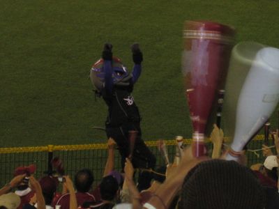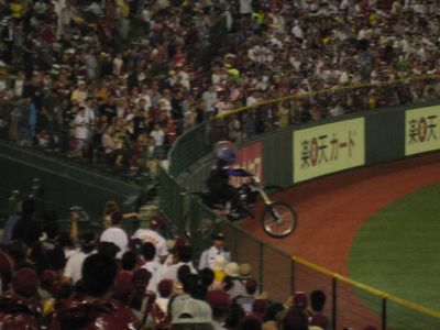 外野から外野スタンド最上段へプレゼントを投げ入れる(爆)