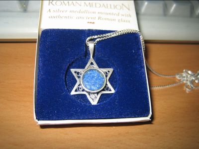 ローマングラスといわれるガラスを使ったシルバーのペンダント。聖地イスラエルの地で発掘された2000年前のガラスが、2000年土に埋まっている間に銀光を放つような独特の化学変化を起こしたもの。ガラスそのものにもコレクターがいるらしい。