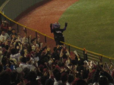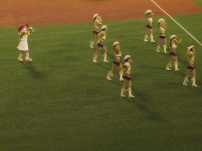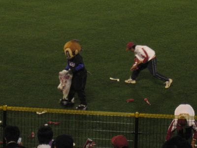 今日は野村監督デーってことで、イニングの合間合間に野村監督の過去の映像とかを編集したものを流してます。そのかわり、いつもなら出てくるマスコットたちが出てこなくて、ようやく出てきたのは5回だったか6回だったか、野村監督の映像が終わってから。いつもなら別々にやるんですが、クラッチーナとゴールデンエンジェルスのダンスと、カラスコのバイクダイブ&外野乱入が同じイニングでやってました。でもクラッチは後ほどのTシャツプレゼント(野村監督夫人プロデュース(^^;; よく模様見えなかったけど、あんまりほしk(げふげふげふ))に出てきただけ。正直、もっと露出を増やさないと、本当にカラスコに人気食われっぱなしだよクラッチ。