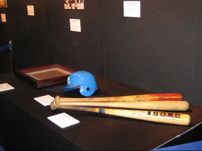 展示品はユニフォームとか現役時代のバットやヘルメット、いろんな賞をもらった時の記念のたてとかトロフィーとか。キャッチャーだったということしかあまり知らない私には結構驚きでした。3冠王とか取ってるんですね!すごいや!打つ人だというイメージがなかったので驚きです。