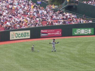 今日は珍しく、日ハムマスコットのB・Bがきてました。動くB・Bを見たのは始めてかも?球場内を自転車でキコキコ〜ライトスタンド前で踊ったり応援団を鼓舞したり。他にもいろいろ動き回ってました。もっと近くで見たかったな〜。