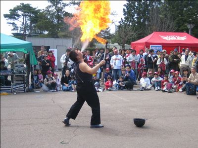 今日も正面広場のあたりでは、大道芸人が芸をやってました。一番広いところにいた芸人さんは、クライマックスで火ぃ吹いてた(爆)スゲエ!(笑)