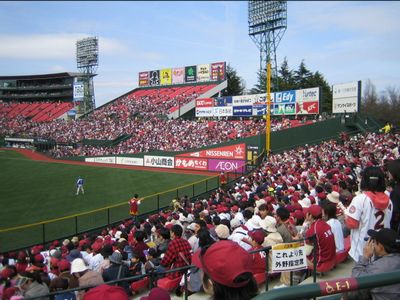 本日は外野レフト。日曜日で天気がいいからか、昨日勝ったからか、客の入りは上々です。あとで発表になった観客数は1万3千人くらい。結構入ってますねー。