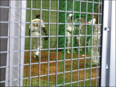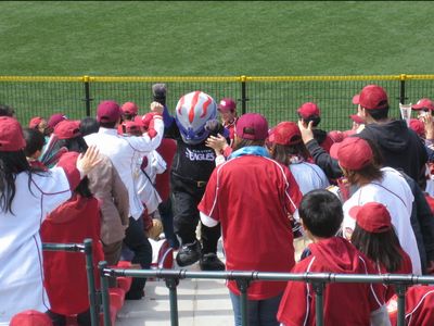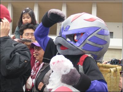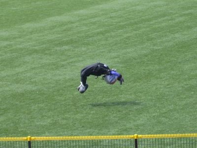 いつものとおりいつものごとく、3回終了時にスコアボード下から飛んだカラスコ、客の大声援の中バクテンして外野に乱入。チームは負けていてもカラスコだけはほんとに元気。