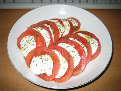 写真ではトマトはそのままスライスしてますが、半分に切ったほうが食べやすいかもしれません。この辺もお好みで。(笑)塩はおいらはしっかり振ったほうが好みかなー。これは後でかければいい話なんで、最初はあまりふらないで味を確かめたほうがよさげです。