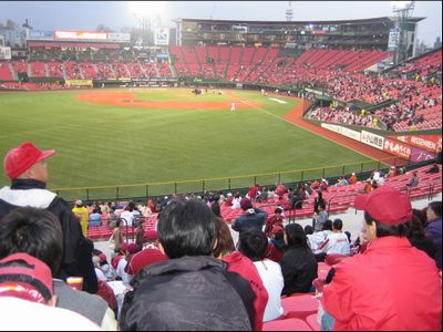 ところで今日は、初めて一人で観戦に行きました。今までいつも2人か3人で行ってるので、最初から最後まで一人きりなのは今日がはじめてです。そして外野レフトの自由席も初めて。外野レフト自由席の所からはこんな感じに見えます。