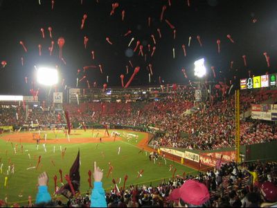 外野自由席ということで、歌を歌いまくる応援団の人たちかな?のすぐ隣だったりして、今回歌って騒いで叫んでがんがんバット叩いてきましたw