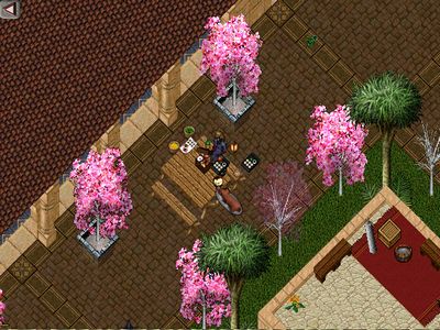 中世のファンタジー世界であるウルティマですが、こないだ徳之島って日本風な場所が出来ましてね。そこのコックさん(日本風でもコックはコック・・・)はお弁当とか寿司とか作ってくれるんですヨ。で、お花見ならお弁当だろ!ってことでお弁当やら寿司やら酒やらなにやら持参して、一人でお花見してきました(爆)
