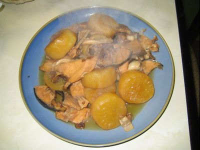 ここからはひじょーに目分量なのでいい加減です(爆)とにかく酒をどぼどぼ。カップ半分〜1くらいでしょうかね。それから砂糖、醤油、みりん。みりんはあんまりたくさんは入れません。砂糖はわりと大目。大きいスプーンで6くらい・・・・・かな?(笑)醤油と砂糖はお好みなので味を見ながら整えてください。煮魚を作るときの要領でいいかな。