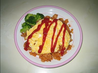 チキンライスを作って、その上にプレーンオムレツを作って、上に乗せて切り開いて作るの。中に巻いて作るより簡単ですし、トロトロ感が出るのでよいw