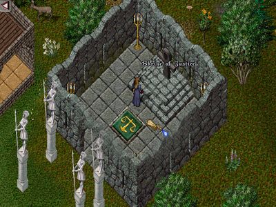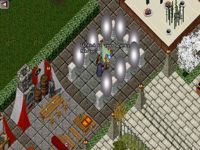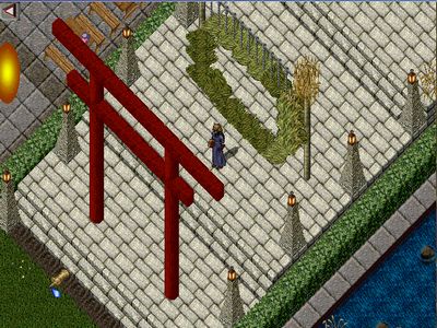 その奥にはおみくじが設置されてます。(白いゲートが並んでいる)ウルティマには、8つの徳の概念があり、それぞれの徳の神殿があります。8つの徳はそれぞれ、献身、謙譲、名誉、霊性、慈悲、武勇、誠実、正義。8つの白いゲートは、キャラクターが入るとそれぞれの神殿に飛ばされる仕組み。