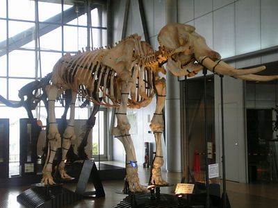 圧巻だったのは、象の行進。古代象の骨格標本やら模型やら、何体も歩いているように並べてあるんです。でっかーーーい!!これは先頭近くの骨格標本。この後ろにはリアルな模型が並んでたり。