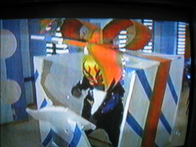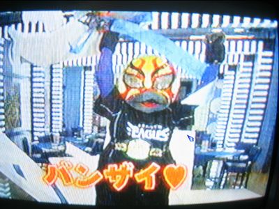 バリバリと発泡スチロール製の箱を破壊しつつ、カラスコ登場!「やっぱり僕の一年は彼で終わるのか〜っ」というアナの叫びを聞いたのか(爆)画面のテロップに