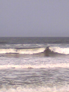 少し波が高かったので、泳いでいる人はいなくてサーファーが遊んでる。犬を連れている人がいて、波が着て慌てた犬が走って逃げてた。(笑)