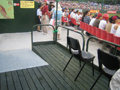 これは3塁側のフィールドコートの障害者席。見ての通り、高床式にして底上げしてます。かなり丈夫なつくりで、木造ですががたついたりしません。9・10番席はスロープをつけたために使えなくなったのかもしれませんが、かなりいい感じで高くなりました。一塁側も見てみたかったな。(実は一塁側は3塁側よりも低かった)