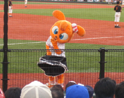 今日は巨人主催試合なので、マスコットもジャビットたち。写真はキッズジャビットの女の子だと思います(スカートだから)。キッズジャビットには男の子もいるそうですが。今日はミスタージャビット(背番号555バージョン)・シスタージャビット・キッズジャビット(女の子)がきてました。ミスタージャビットの背番号は333・555・777がいるそうですね。