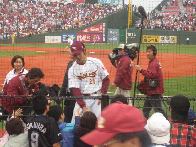 試合は、楽天が2対5で見事勝ちました。勝利投手の岩隈選手。お立ち台のあとでグラウンドを一周している時のもの。おいらが見にいくと大抵応援してたほうが負けるので、今日は嬉しかったです。風船も飛ばしたし。