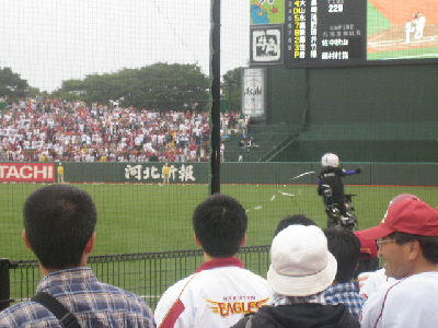 他の球場と違って、ロッテ側がライト側、つまり一塁側になります。でもほとんどの席は楽天ファンで埋まっていて、ロッテファンは外野に固まっていたりします。楽天ファンがクリムゾンレッドのユニホームなのに対し、ロッテは黒。黒い波のように見えます。
