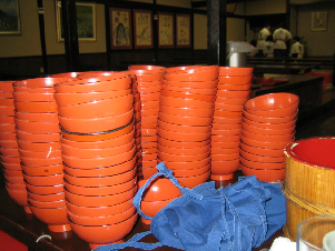 さてわんこそばですが、最初に自分用のおわんと薬味がやってきます。薬味は、けずりぶし、わさび、もみじおろし、ネギ、なめこおろし、鳥そぼろ、ノリ、唐子みそ、ごまなどと多彩。それを乗せながら食べるもよし、ひたすら食べて量を狙うもよし。(爆)おしんことデザートもついて、いくつ食べたかわかるように、店員さんがおわんを重ねると3100円、自分で数える形式だと2600円。(笑)もちろん数えるのは面倒なので重ねてもらいました。