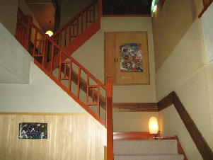 店の入り口。ここは本店です。丁度たどり着いたら、修学旅行の中学生がぞろぞろ出てくるところでした。ここは普通のおそばも食べられるのですが、わんこそば希望者は二階の座敷に上げられます。ちょうど団体が帰り、外国人を交えたもうひと組とうちらだけなのでがらんと広い。