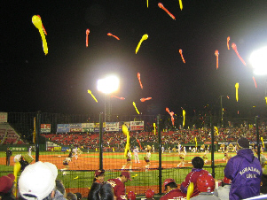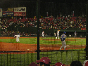 なんかこういう雰囲気、いいなぁ。誰かが打った瞬間、前に座ってたフィールドシートの観客が一斉に立ち上がって、メガホンやら拳やら突き上げた。ああいうの。今までなかったよ。(以前は一番前、要するに一番下にいたので見えなかっただけかも)