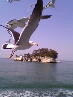 船がでるとすぐにかもめが大量に追いかけてきます。それに餌としてかっぱえびせんをまく!まく!(笑)それはもうヒッチコックかと言う感じで追いかけてきてます。男ジャックなら卒倒するだろうなぁと思いつつ餌付け。投げずに手で持っていると、元気のいいのが手から餌をダッシュ。ついでに手まで食われました(爆)