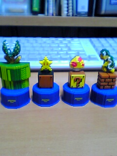 スーパーマリオブラザーズキャラをボトルキャップにしたものなんですが、ありがちなフィギュアの感じでなくて、ドットっぽい感じに仕上げてあるのです。・・・・前半分だけ(爆)後ろ半分はぺったーっとたいら。スターときのこが可愛いよ!なんか30種類あるらしい。ノコノコとかクリボーとかもいるのかな!ああああ探してええ(爆)つーかパックンフラワーでかっ。
