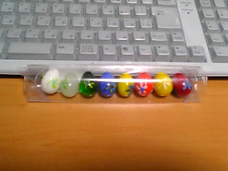 100円ショップにて発見、卵形のとんぼ玉!おしい。7色そろってたらよかったのに(爆)例によって藍色と紫色がありませんよ。しくしく。
